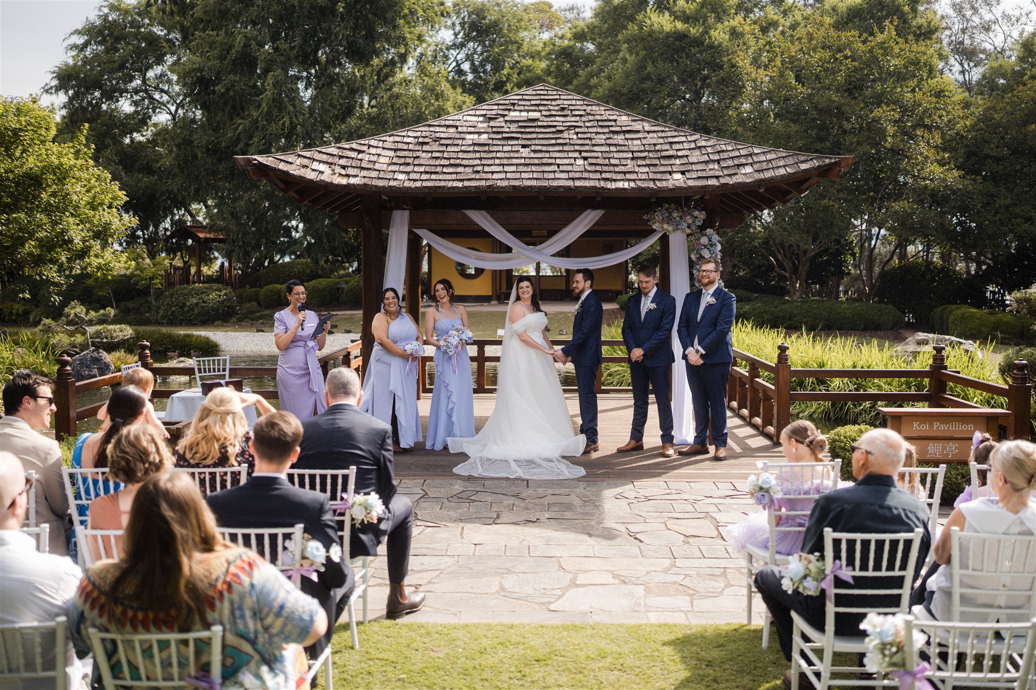 The garden offers a beautiful outdoor venue for weddings and other functions. Weddings are normally held in the Koi Pavilion, which provides limited shelter. This space is suitable for small intimate weddings, naming ceremonies and other functions. The surrounding outdoor space is large enough to cater for wedding parties of up to 150 people.